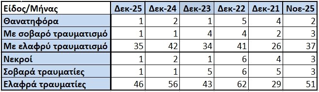 Αναφορικά με το μήνα Δεκέμβριο, στον παραπάνω θλιβερό πίνακα, πρόσθεσε μόνο ένα τροχαίο δυστύχημα και ένα ακόμη ατύχημα με σοβαρό τραυματισμό. Γενικά ο Δεκέμβριος του ’25 ήταν ο μήνας με τις λιγότερες θλιβερές ειδήσεις και ο "καλύτερος" Δεκέμβριος των τελευταίων 5 ετών.
