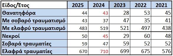 Αν και σε απόλυτους αριθμούς σε τροχαία και άτομα που ενεπλάκησαν σε αυτά, είχαμε μείωση, δυστυχώς τη χρονιά που μας πέρασε, θρηνήσαμε την απώλεια 50 συνανθρώπων μας έναντι 45 το 2024 και 29 το 2023.