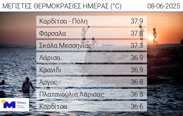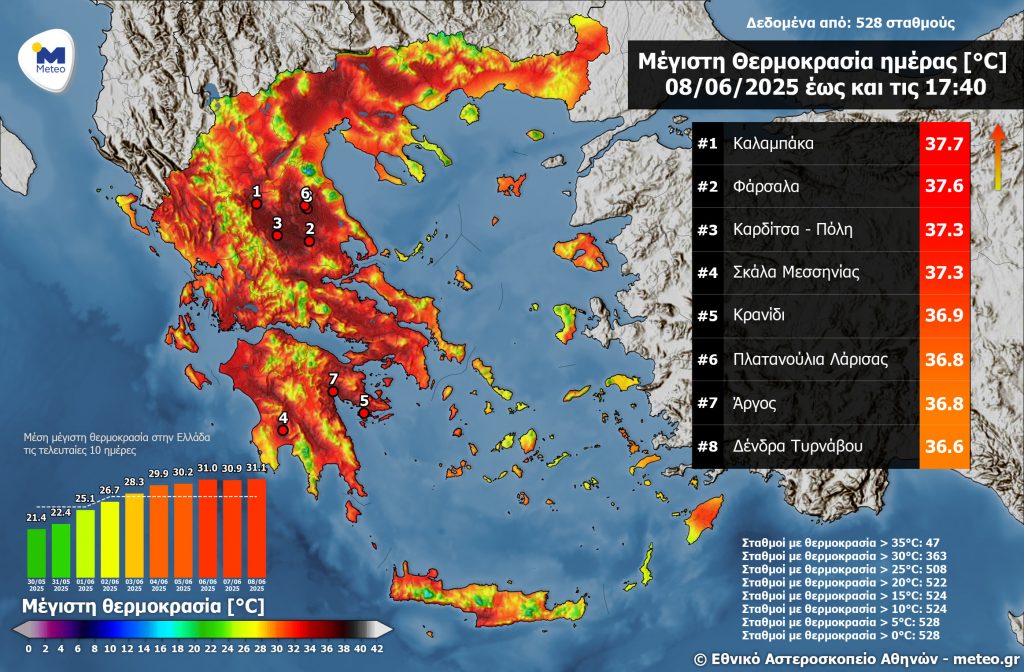Σε υψηλά επίπεδα διατηρήθηκε η θερμοκρασία την Κυριακή 08/06, με τις μέγιστες τιμές της να ξεπερνούν τους 37 °C.