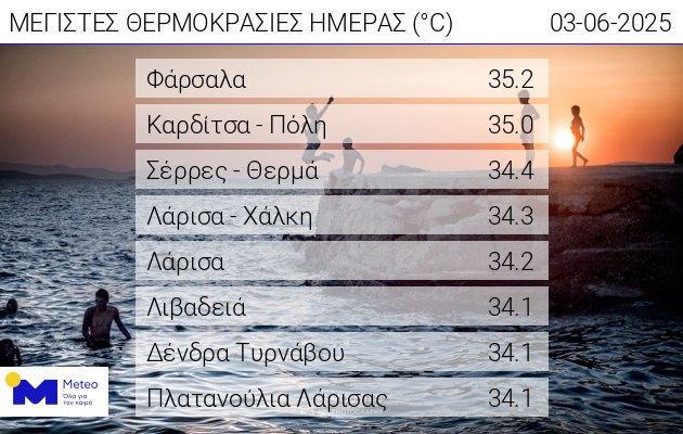 Ενδεικτικά στις 8 υψηλότερες θερμοκρασίες της ημέρας οι 6 σημειώθηκαν στη Θεσσαλία με τη μεγαλύτερη στα Φάρσαλα όπου είχαμε 35.2. Στην 1η εξάδα και η Λιβαδειά: