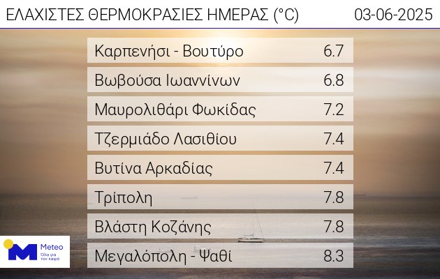 Είναι χαρακτηριστικό πάντως ότι για την Τρίτη 3/6 στη Φθιώτιδα είχαμε ελάχιστες θερμοκρασίες γύρω στους 12 με 13 βαθμούς. Ακόμη και στη Λαμία ο υδράργυρος εκκίνησε κάτω από τους 20 βαθμούς.