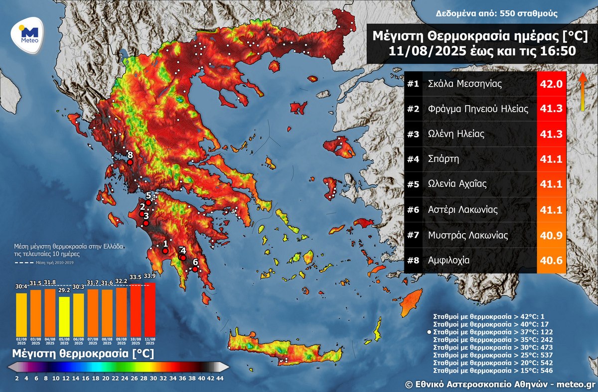 Υψηλές θερμοκρασίες καταγράφηκαν στην χώρα τη Δευτέρα 11/08, με τη μέγιστη θερμοκρασία στην Πελοπόννησο να φτάνει τους 42 °C, ενώ ανάλογα θερμά ήταν τα πράγματα στην Ανατολική Μακεδονία και τη Θράκη.