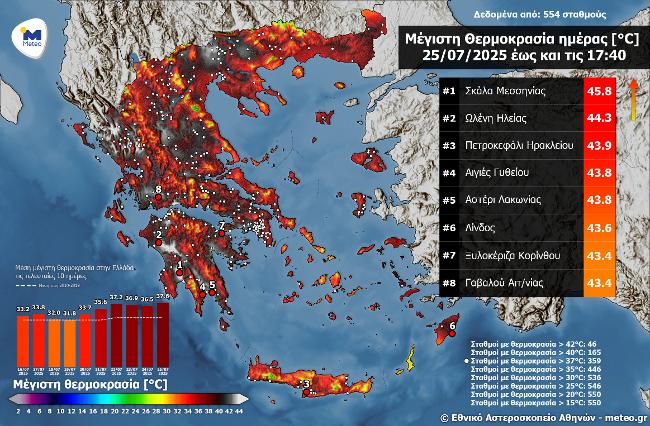 Την ίδια ώρα 46 σταθμοί κατέγραψαν άνω των 42 βαθμών σύμφωνα με τον παρακάτω χάρτη του meteo.gr: