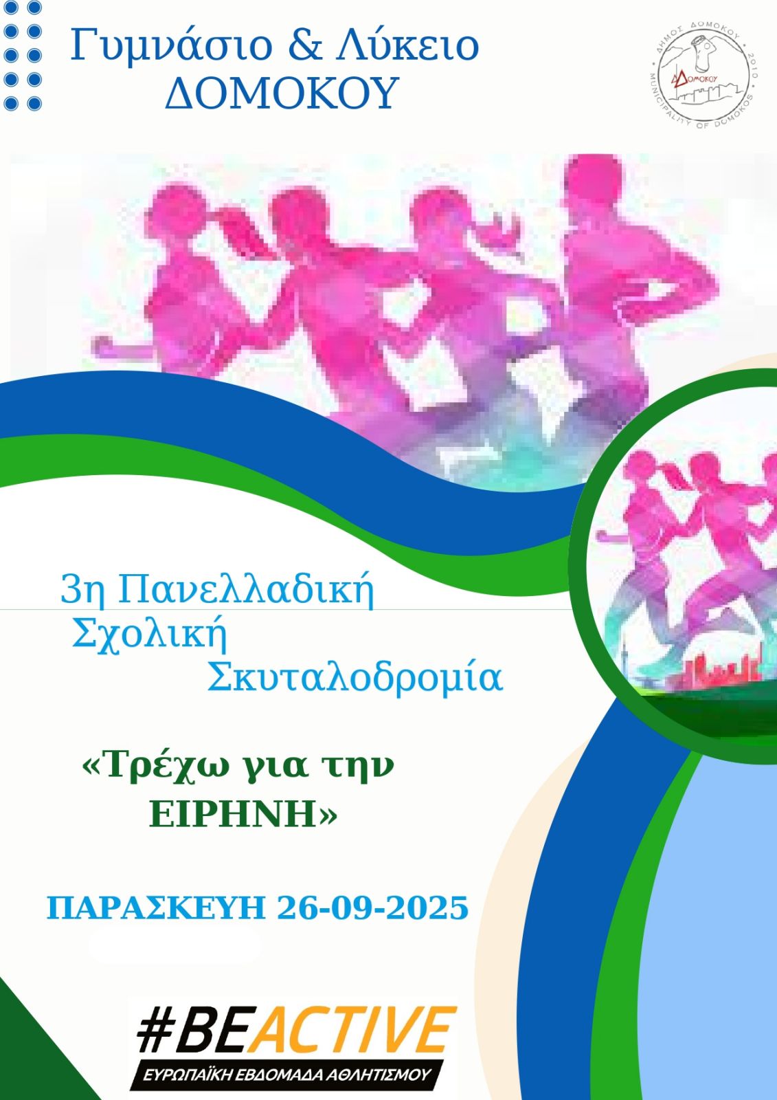 Το Γυμνάσιο και Λύκειο Δομοκού συμμετέχουν στην 3η Πανελλαδική Σχολική Σκυταλοδρομία με τίτλο «Τρέχω για την ΕΙΡΗΝΗ». Η εκδήλωση, η οποία πραγματοποιείται στο πλαίσιο της Ευρωπαϊκής Εβδομάδας Αθλητισμού (#BEACTIVE), στοχεύει στην προώθηση του αθλητικού ιδεώδους και των αξιών της ειρήνης.