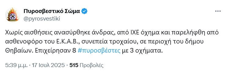 Στο σημείο έφτασαν οκτώ πυροσβέστες με τρία οχήματα από την Π.Υ. Θηβών για τον απεγκλωβισμό του άτυχου άνδρα. Δυστυχώς οι πυροσβέστες τον απεγκλώβισαν χωρίς τις αισθήσεις του και τον παρέδωσαν σε ασθενοφόρο του ΕΚΑΒ για τη διακομιδή του στο Γενικό Νοσοκομείο. Εκεί διαπιστώθηκε και ο θάνατός του.