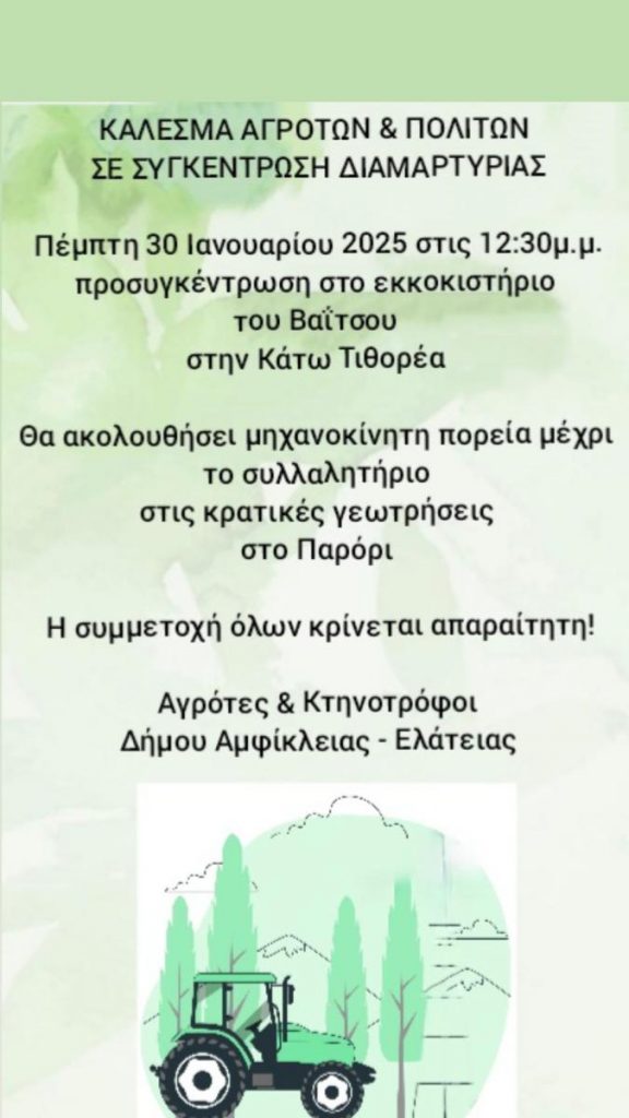 Στο πλαίσιο αυτό σήμερα (30/1/25) στις 12:30’ το μεσημέρι στο εκκοκιστήριο Βαΐτσου στην Κάτω Τιθορέα, θα πραγματοποιηθεί προσυγκέντρωση αγροτών - κτηνοτρόφων με τις οικογένειές τους κι άλλους πολίτες, καθώς απειλείται και η δυνατότητα ύδρευσης. Θα ακολουθήσει μηχανοκίνητη πορεία για το συλλαλητήριο που οργανώνεται στο Παρόρι Βοιωτίας.