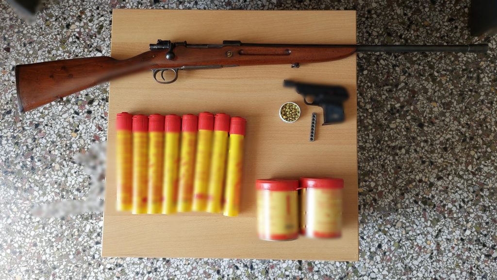 Η σύλληψή του πραγματοποιήθηκε από αστυνομικούς του Τμήματος Δίωξης και Εξιχνίασης Εγκλημάτων Λιβαδειάς, διότι σε επιχείρηση ιδιοκτησίας του, βρέθηκαν και κατασχέθηκαν 8 βεγγαλικά, 2 καπνογόνα, 1 πιστόλι εκτόξευσης φωτοβολίδων με γεμιστήρα, 85 αβολίδωτα καψύλια, καθώς και 1 τυφέκιο όπλο (λειόκαννο), στερούμενος σχετικής άδειας από την αρμόδια αρχή.