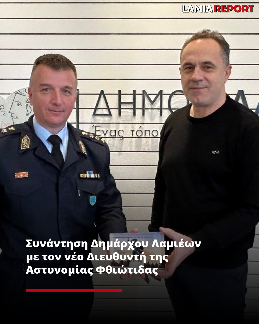 Ο Δήμαρχος Λαμιέων, Πανουργιάς Παπαϊωάννου, συναντήθηκε το πρωί της Δευτέρας 24 Φεβρουαρίου, στο Δημαρχείο με τον νέο Διευθυντή της Διεύθυνσης Αστυνομίας Φθιώτιδας, Ανδρέα Κυρίτση, παρουσία και της Αντιδημάρχου Δημοτικής Αστυνομίας - Κοινόχρηστων Χώρων, Ευαγγελίας Ματσούκα – Χάψα.