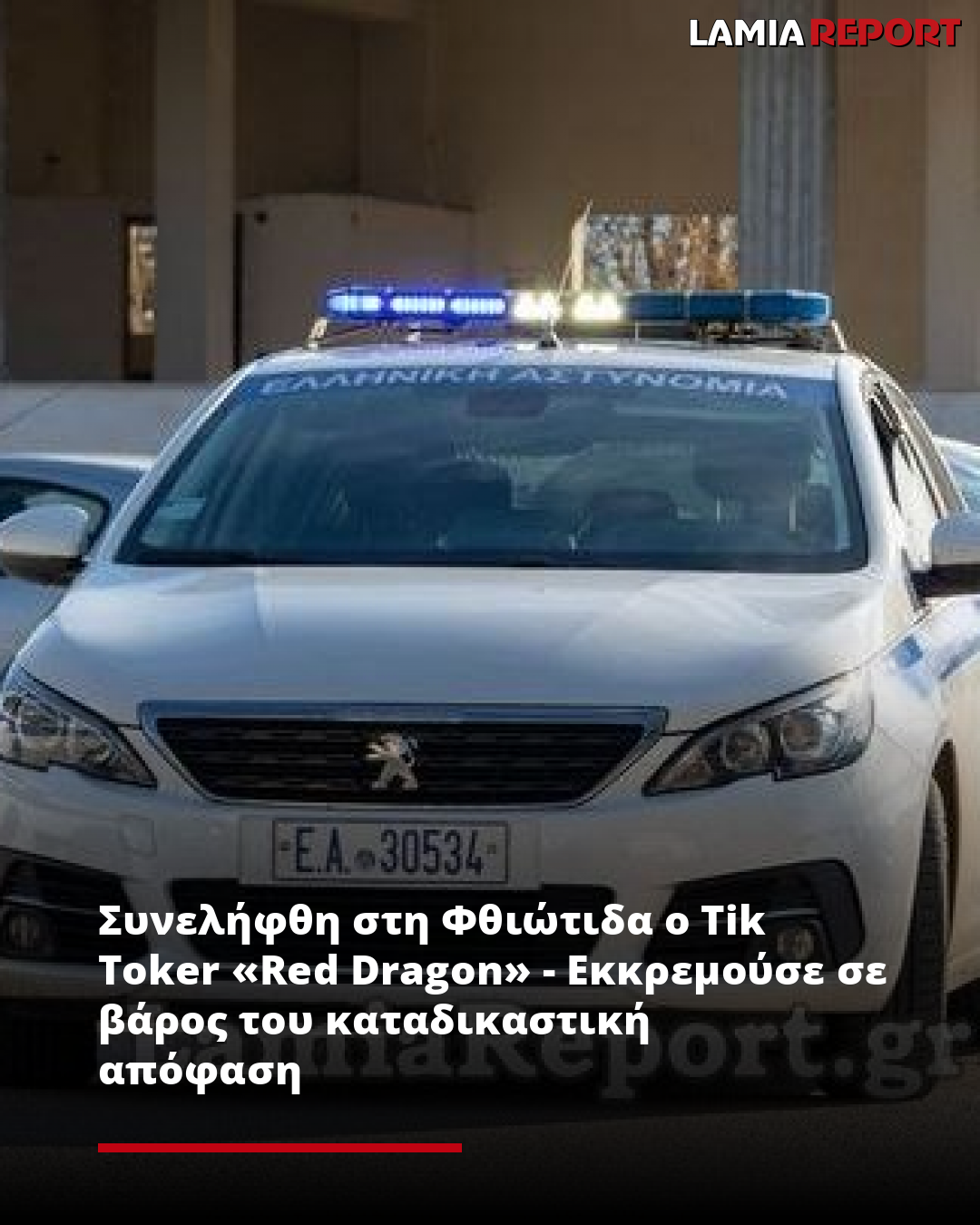 Συνελήφθη αργά το βράδυ της Παρασκευής (22/11) σε περιοχή της Δυτικής Φθιώτιδας από αστυνομικούς του ΑΤ Σπερχειάδας, ο γνωστός Tik Toker «Red Dragon», καθώς σε βάρος του εκκρεμούσε καταδικαστική απόφαση του Μονομελούς Πλημμελειοδικείου Αθηνών με ποινή φυλάκισης 18 μηνών για προσβολή γενετήσιας αξιοπρέπειας κατά συρροή.