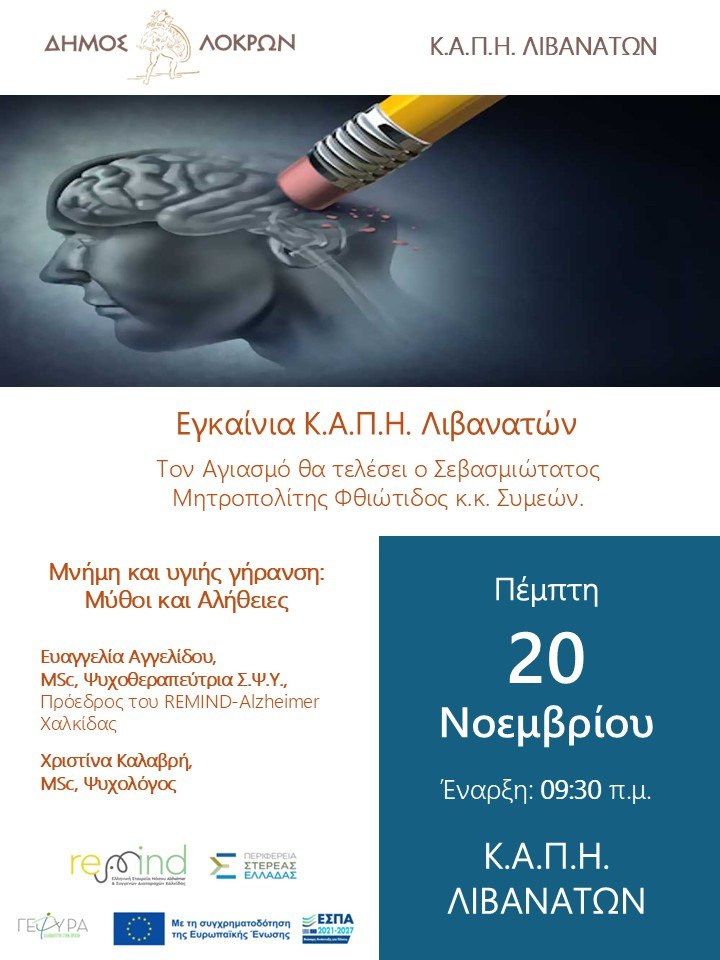 Θα ακολουθήσει ενημέρωση με θέμα: «Μνήμη και υγιής γήρανση: Μύθοι και Αλήθειες», στο πλαίσιο προγράμματος που υλοποιείται, σε συνεργασία με την Περιφέρεια Στερεάς Ελλάδας και τη Δομή Γέφυρα.