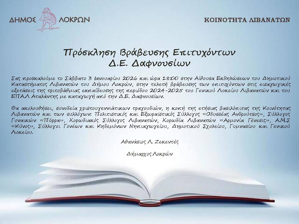 Ο Δήμος Λοκρών σάς προσκαλεί το Σάββατο 3 Ιανουαρίου 2026 και ώρα 18:00, στην Αίθουσα Εκδηλώσεων του Δημοτικού Καταστήματος Λιβανατών του Δήμου Λοκρών, στην τελετή βράβευσης των επιτυχόντων στις εισαγωγικές εξετάσεις της τριτοβάθμιας εκπαίδευσης της περιόδου 2024-2025 του Γενικού Λυκείου Λιβανατών και του ΕΠΑ.Λ. Αταλάντης, με καταγωγή από την Δ.Ε. Δαφνουσίων.