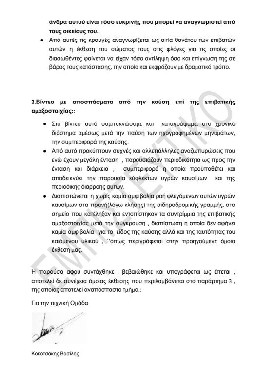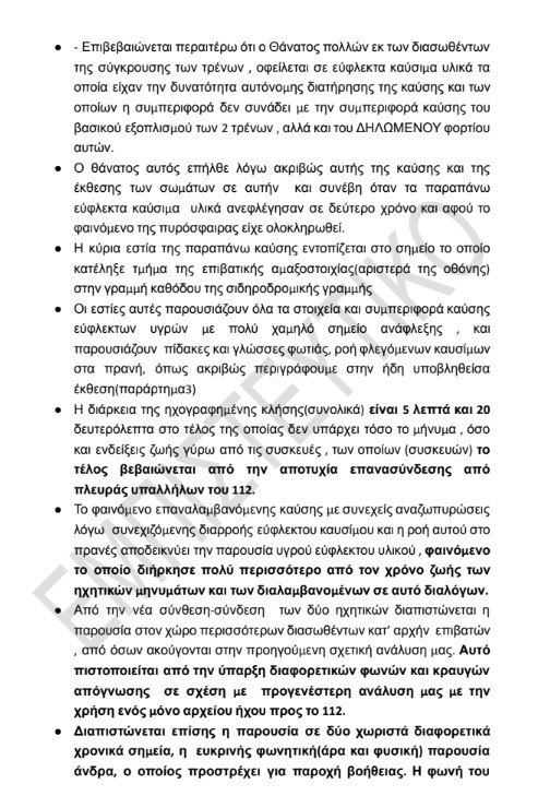 Όπως τονίζει ο Βασίλης Κοκοτσάκης σε συνοδευτική έκθεση, επιβεβαιώνεται ότι ο θάνατος πολλών εκ των διασωθέντων της σύγκρουσης των τρένων, "οφείλεται σε εύφλεκτα καύσιμα υλικά τα οποία είχαν τη δυνατότητα αυτόνομης διατήρησης της καύσης και των οποίων η συμπεριφορά δεν συνάδει με τη συμπεριφορά καύσης του βασικού εξοπλισμού των 2 τρένων, αλλά και του δηλωμένου φορτίου αυτών".