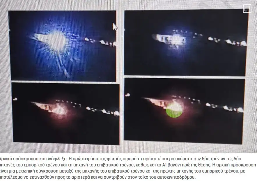 Τα πρώτα δραματικά δευτερόλεπτα μετά τη σύγκρουση των αμαξοστοιχιών, όπου σημειώθηκαν δύο τεράστιες εκρήξεις και τα βαγόνια του Intercity 62 τυλίγονται στις φλόγες, περιγράφονται στο προσχέδιο του πορίσματος για τη διερεύνηση της τραγωδίας στα Τέμπη, που φέρνει στη δημοσιότητα σήμερα Τετάρτη (5.2.25) η εφημερίδα «Καθημερινή».