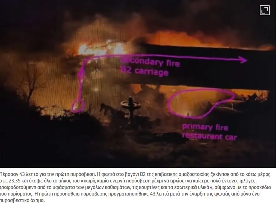 Η φωτιά στο βαγόνι Β2 της επιβατικής ξεκίνησε από το κάτω μέρος στις 23:35 και στη συνέχεια έκαψε όλο το μήκος του «χωρίς καμία ενεργή πυρόσβεση μέχρι να αρχίσει να καίει με πολύ έντονες φλόγες, τροφοδοτούμενη από τα υφάσματα των μεγάλων καθισμάτων, τις κουρτίνες και τα εσωτερικά υλικά», σύμφωνα με το πόρισμα. Μέχρι τις 00:40 η φωτιά είχε κάψει ολόκληρο το βαγόνι B2 και είχε αρχίσει να σβήνει από μόνη της, καθώς δεν υπήρχε άλλο καύσιμο υλικό.