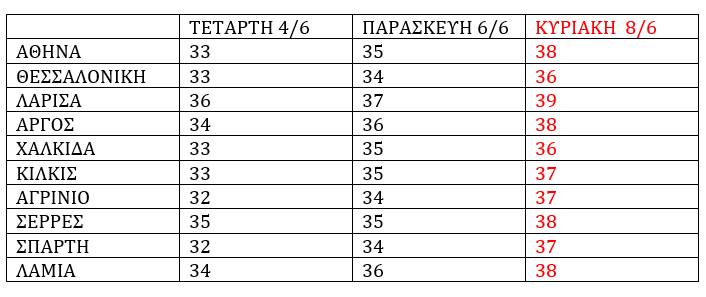 Στην ανάρτησή του ο μετεωρολόγος Γιώργος Τσατραφύλλιας δημοσιεύει έναν πίνακα με τις θερμοκρασίες των επόμενων ημερών, όπου εκτιμά ότι στη Λαμία την Κυριακή η θερμοκρασία θα φτάσει τους 38 βαθμούς Κελσίου.