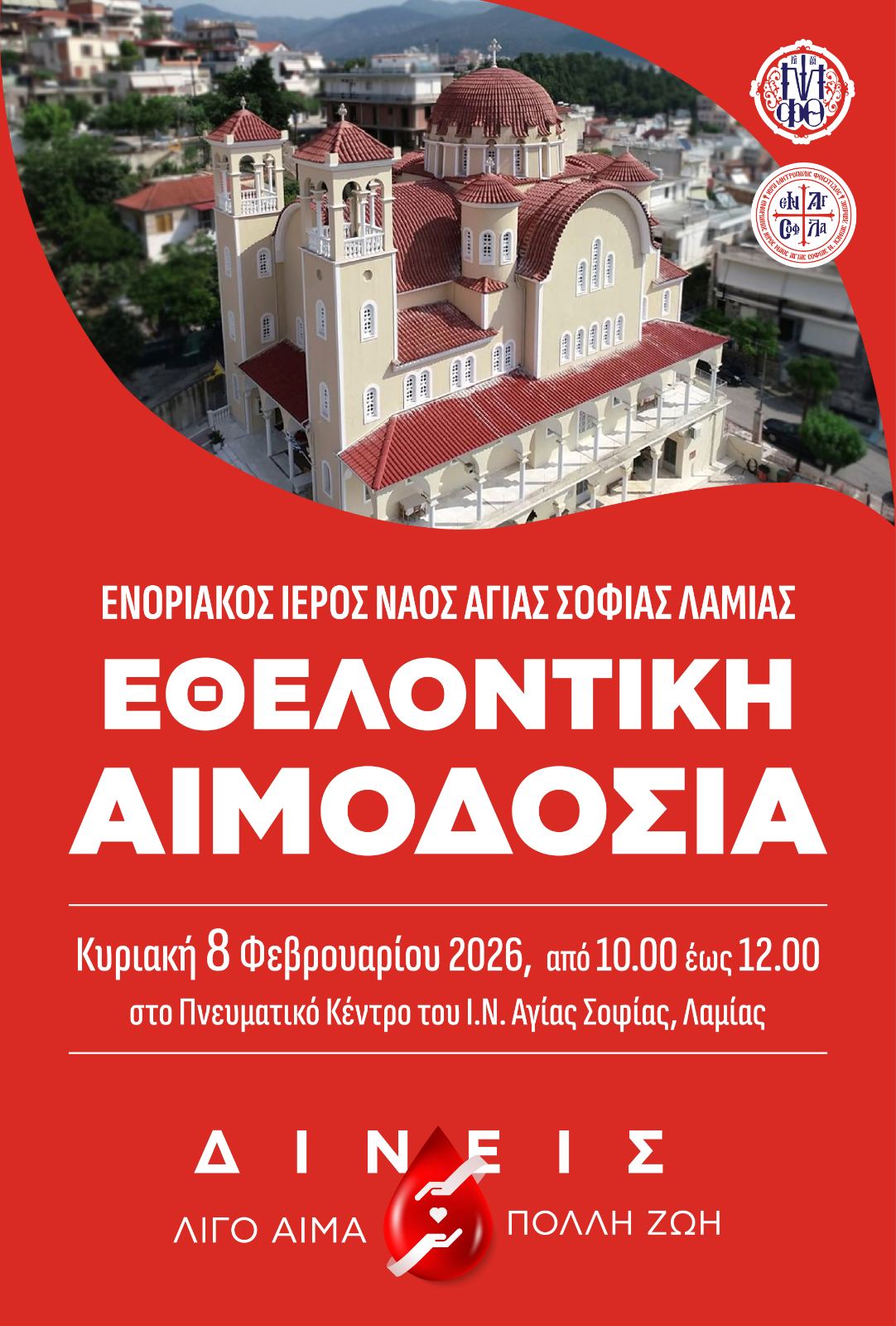 Στην προσπάθεια μας αυτή καλούμε όλους τους αιμοδότες, αλλά και όσους για πρώτη φορά θέλουν να βοηθήσουν στην προσπάθεια αυτή της τοπικής μας Εκκλησίας, να προσέλθουν την Κυριακή 8 Φεβρουαρίου 2026 στον Πνευματικό Κέντρο του Ιερού Ναού Αγίας Σοφίας Λαμίας, και να προσφέρουν αίμα.