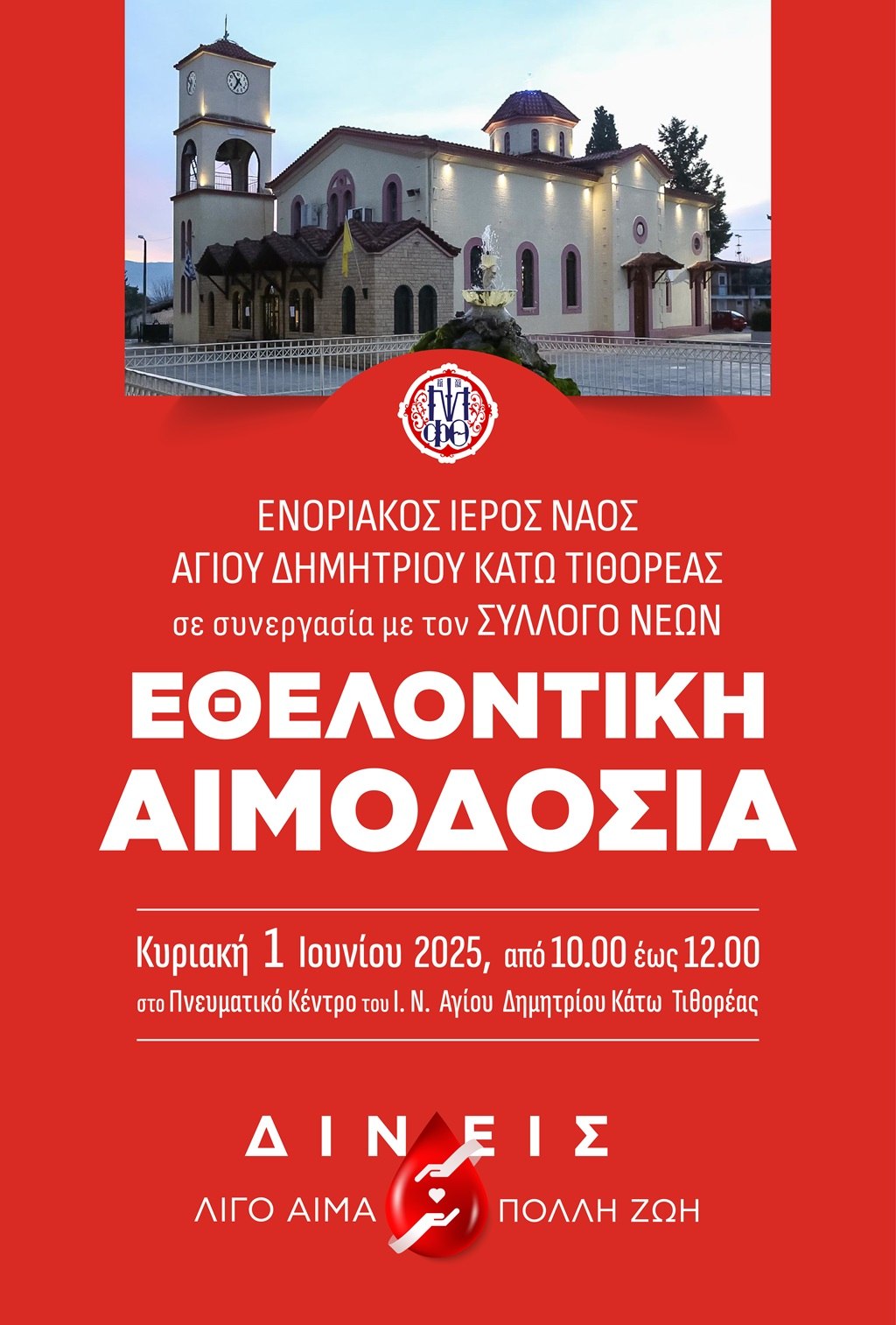Στην προσπάθεια μας αυτή καλούμε όλους τους αιμοδότες, αλλά και όσους για πρώτη φορά θέλουν να βοηθήσουν στην προσπάθεια αυτή της τοπικής μας Εκκλησίας, να προσέλθουν την Κυριακή 1 Ιουνίου 2025 στον Πνευματικό Κέντρο του Ιερού Ναού Αγίου Δημητρίου Κάτω Τιθορέας, και να προσφέρουν αίμα.