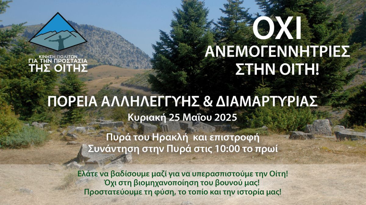Με τα συνθήματα «Λέμε ΟΧΙ στη βιομηχανοποίηση του βουνού μας! Προστατεύουμε τη φύση, το τοπίο και την ιστορία μας!», ο Όμιλος Φίλων του Δάσους με την Κίνηση Πολιτών για την Προστασία της Οίτης, διοργανώνουν συμβολική Πορεία Διαμαρτυρίας και Αλληλεγγύης στην Οίτη.