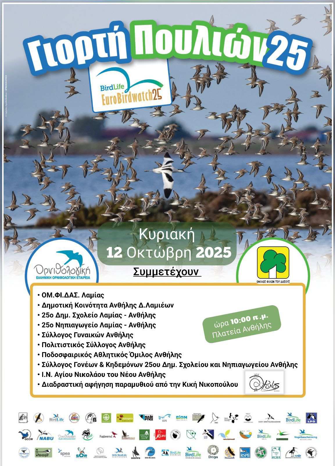 Αυτή την Κυριακή 12 Οκτωβρίου 2025 , με αφορμή την Ευρωπαϊκή Γιορτή των Πουλιών, τη γιορτή που είναι αφιερωμένη στη φθινοπωρινή μετανάστευση, περπατάμε στο Δέλτα του Σπερχειού - Μαλιακού. Μια εύκολη για όλους, κυκλική διαδρομή, 8 χμ και διάρκειας 2.30 ωρών με αφετηρία την πλατεία της Ανθήλης στις 10.00 το πρωί.