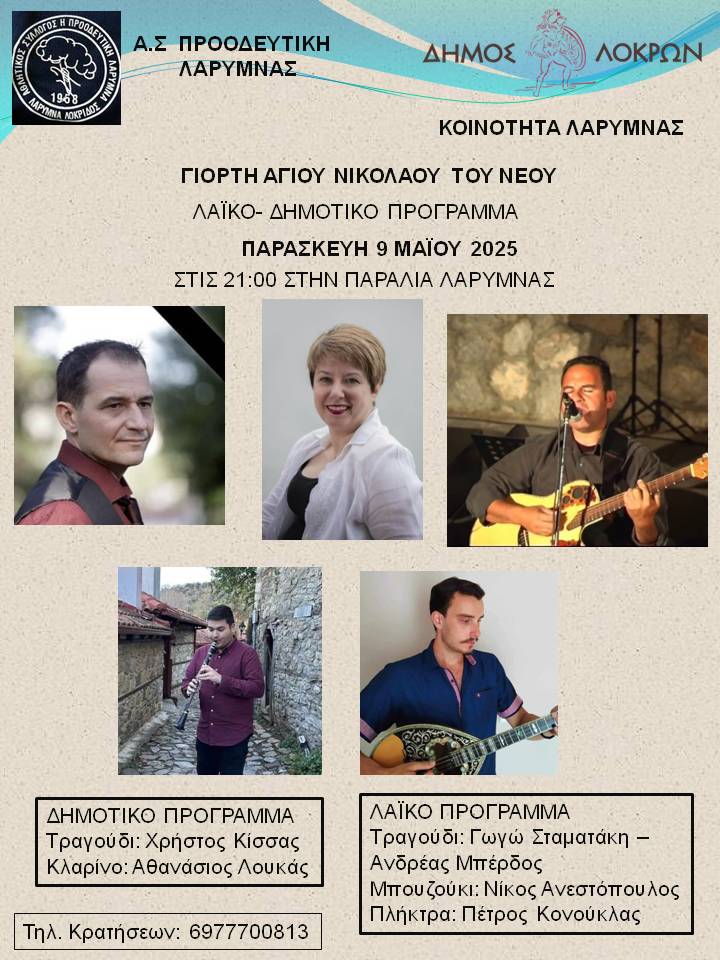 Ο Δήμος Λοκρών σας προσκαλεί στο γλέντι που θα πραγματοποιήσει την Παρασκευή 9 Μαΐου 2025 στη Λάρυμνα για τον εορτασμό του Αγίου Νικολάου του Νέου.