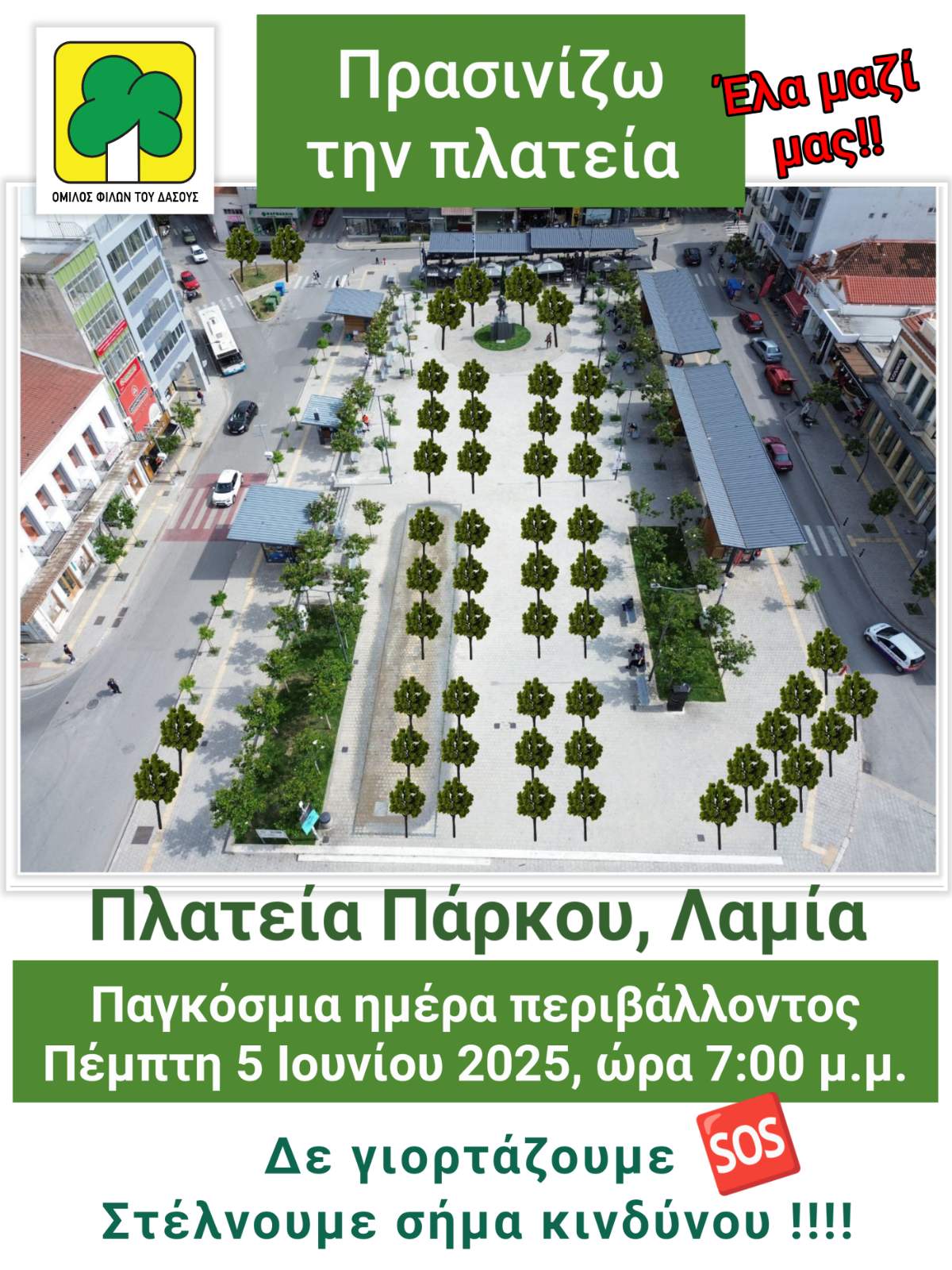 «Την Πέμπτη 5 Ιουνίου 2025, στις 7.00μ.μ. πάμε σε μια πλατεία που της λείπει το πράσινο. Όλοι ερχόμαστε με ένα λουλούδι, ένα γλαστράκι, ένα δεντράκι, ενημερωνόμαστε για τη σημασία του αστικού πρασίνου, διεκδικούμε περισσότερο πράσινο και κοινόχρηστους χώρους στην πόλη μας.»