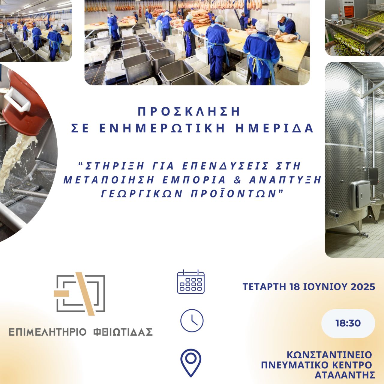 Το Επιμελητήριο Φθιώτιδας διοργανώνει στην Αταλάντη ημερίδα: «Επένδυσε στη Μεταποίηση/εμπορία και ανάπτυξη γεωργικών προϊόντων»
