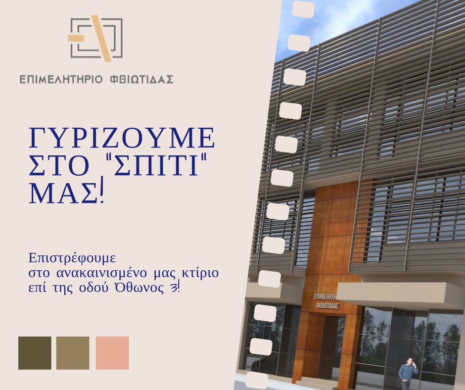 Η μετακόμιση ολοκληρώθηκε και από την Τετάρτη (1/10) το Επιμελητήριο Φθιώτιδας εξυπηρετεί τα μέλη του στο νέο ανακαινισμένο κτίριο, επί της οδού Όθωνος 3, στη Λαμία.