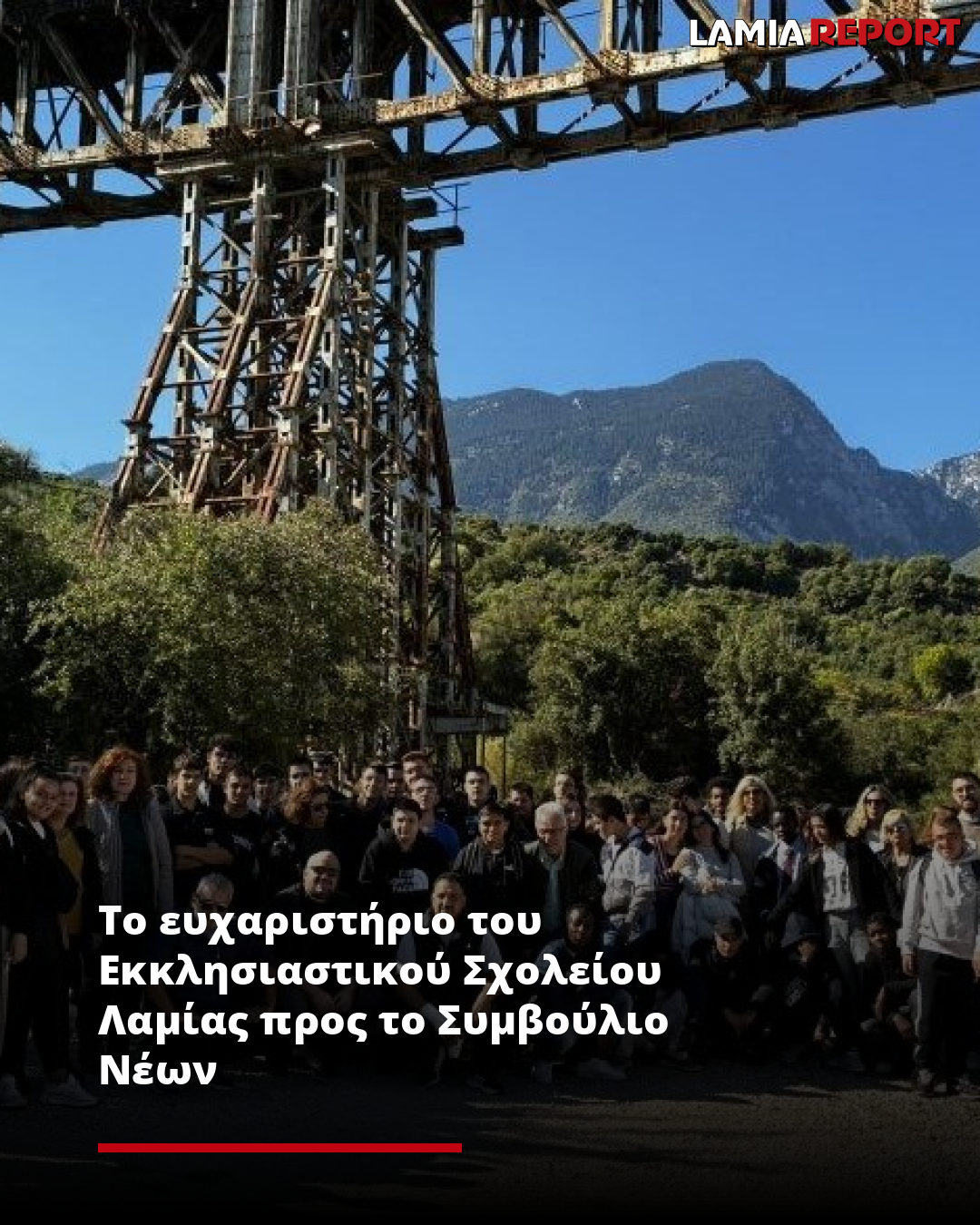 «Το Πρότυπο Εκκλησιαστικό Γυμνάσιο – Πρότυπο Εκκλησιαστικό Λύκειο Λαμίας «Όσιος Βησσαρίων ο Αγαθωνίτης» επιθυμεί, διά της παρούσης, να εκφράσει τις θερμές του ευχαριστίες προς το Συμβούλιο Νέων του Δήμου Λαμιέων για την ευγενική του πρωτοβουλία να προσκαλέσει, την παρελθούσα Πέμπτη 9 Οκτωβρίου 2025, τους μαθητές του Σχολείου μας σε ξενάγηση στην ιστορική γέφυρα του Γοργοποτάμου, στο πλαίσιο του καινοτόμου προγράμματος «Ξενάγηση στα Ιστορικά Τοπόσημα του Τόπου μας», μεριμνώντας και για την δωρεάν μετακίνησή τους.
