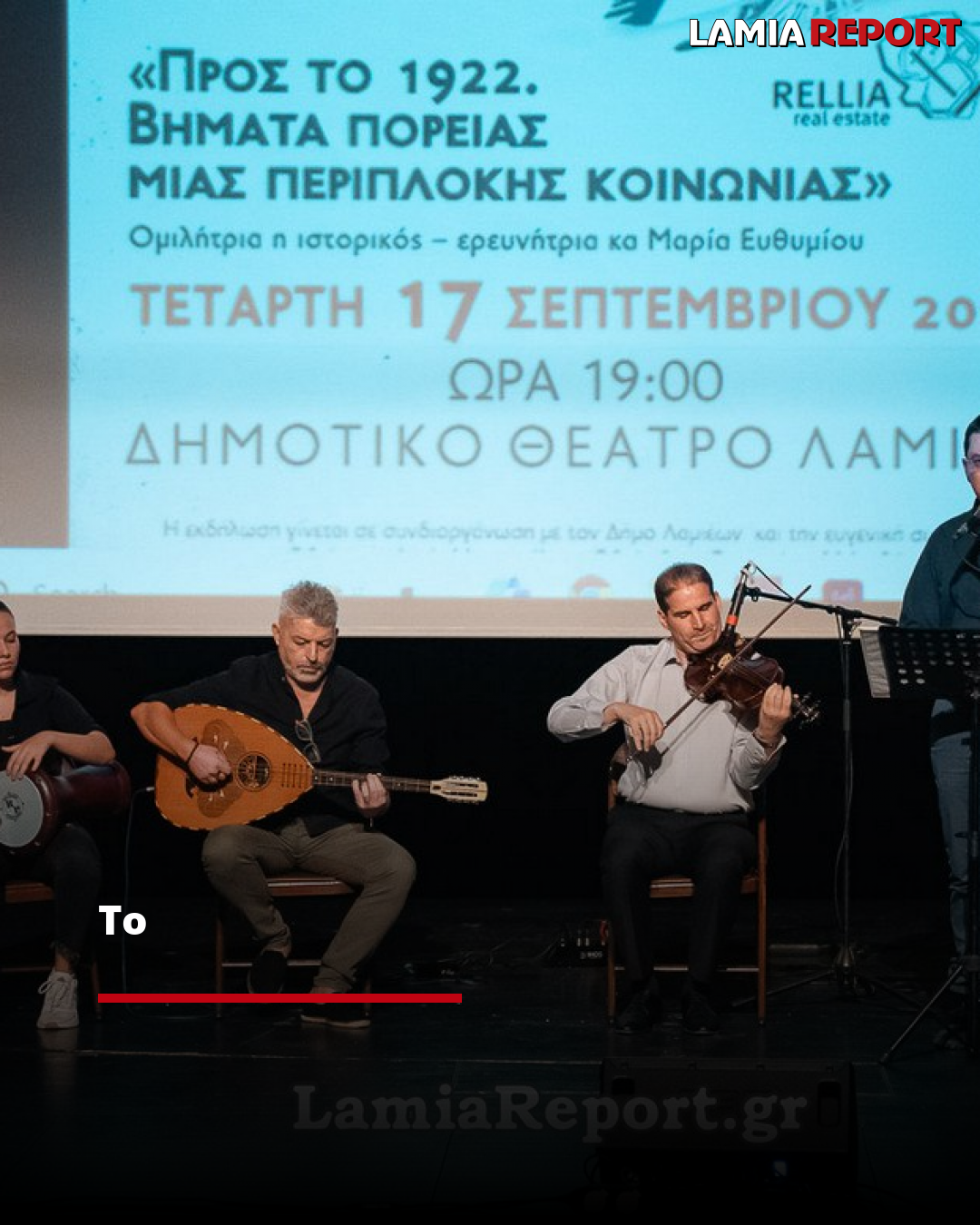 Η Ένωση Μικρασιατών Λαμίας «Ο Άγιος Χρυσόστομος Σμύρνης», σε συνδιοργάνωση με τον Δήμο Λαμιέων και την ευγενική συμμετοχή του Ωδείου της Ιεράς Μητροπόλεως Φθιώτιδος «Γερμανός ο Μελωδός», την Τετάρτη 17 Σεπτεμβρίου, στο Δημοτικό Θέατρο Λαμίας, πραγματοποίησε με μεγάλη επιτυχία την εκδήλωση «ΜΙΚΡΑΣΙΑΤΙΚΕΣ ΑΝΑΜΝΗΣΕΙΣ 2025» με τίτλο: «Προς το 1922. Βήματα πορείας μιας περίπλοκης κοινωνίας» και ομιλήτρια την ιστορικό – ερευνήτρια κα Μαρία Ευθυμίου.