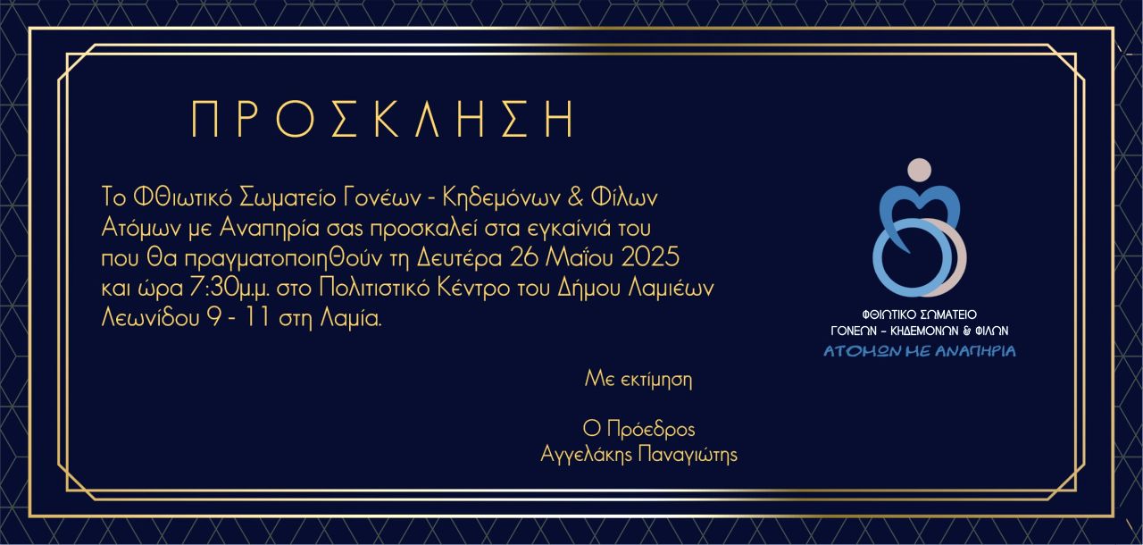 Το Φθιωτικό Σωματείο Γονέων - Κηδεμόνων & Φίλων Ατόμων με αναπηρία έχει εγκαίνια και σας προσκαλεί να το τιμήσετε με την παρουσία σας!