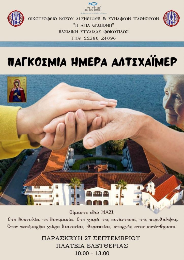 Με χαρά σάς ανακοινώνουμε πως στα πλαίσια της Παγκόσμιας Ημέρας Alzheimer 21/09, το Οικοτροφείο Νόσου Alzheimer και Συναφών Παθήσεων «Η Αγία Ερμιόνη» της Ιεράς Μητρόπολης Φθιώτιδος και της Αποστολής, που στεγάζεται σε σύγχρονης εργονομίας οικοδομικό συγκρότημα της Mητροπόλεώς μας στην ειδυλλιακή τοποθεσία Βασιλική Στυλίδος, πραγματοποιεί δράση την Παρασκευή 27 Σεπτεμβρίου 2024 στην πλατεία Ελευθερίας Λαμίας, από τις 10:00 έως την 13:00 μ.μ. με στόχο την ευαισθητοποίηση των συνανθρώπων μας για την συχνή και απειλητική πλέον νόσο της άνοιας, την παροχή πλούσιας ενημέρωσης για τις υπάρχουσες δομές και τις διαθέσιμες υπηρεσίες για άτομα με άνοια και τους φροντιστές τους, προτείνοντας τρόπους βελτίωσης της ζωής των ασθενών και των οικογενειών τους και την παροχή διευκρινίσεων και λύσεων αποριών λόγω παραπληροφόρησης.