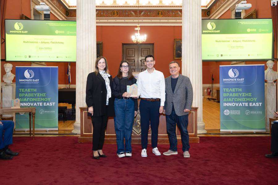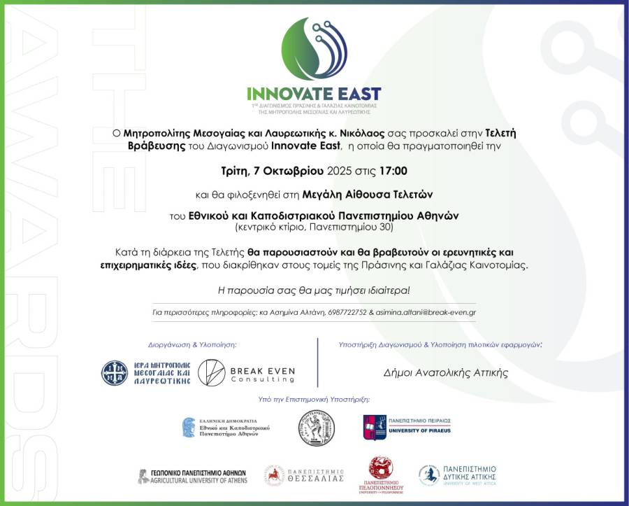 Με ιδιαίτερη επιτυχία πραγματοποιήθηκε την Τρίτη 7 Οκτωβρίου 2025 η Τελετή Βράβευσης του 1ου Διαγωνισμού Πράσινης και Γαλάζιας Καινοτομίας “Innovate East”, στην εμβληματική Μεγάλη Αίθουσα Τελετών του Εθνικού και Καποδιστριακού Πανεπιστημίου Αθηνών.