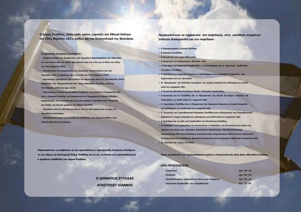 - Δοξολογία στο Μητροπολιτικό Ναό Αγίου Αθανασίου Στυλίδας κατά την 25η Μαρτίου 2026 και ώρα 10:00.