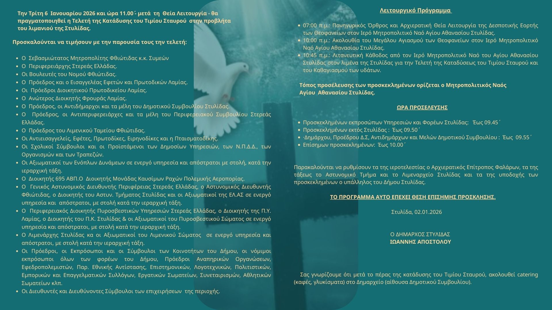 Ο Δήμος Στυλίδας μας προσκαλεί στην Τελετή Κατάδυσης του Τιμίου Σταυρού ανήμερα των Θεοφανίων στο λιμάνι της Στυλίδας.