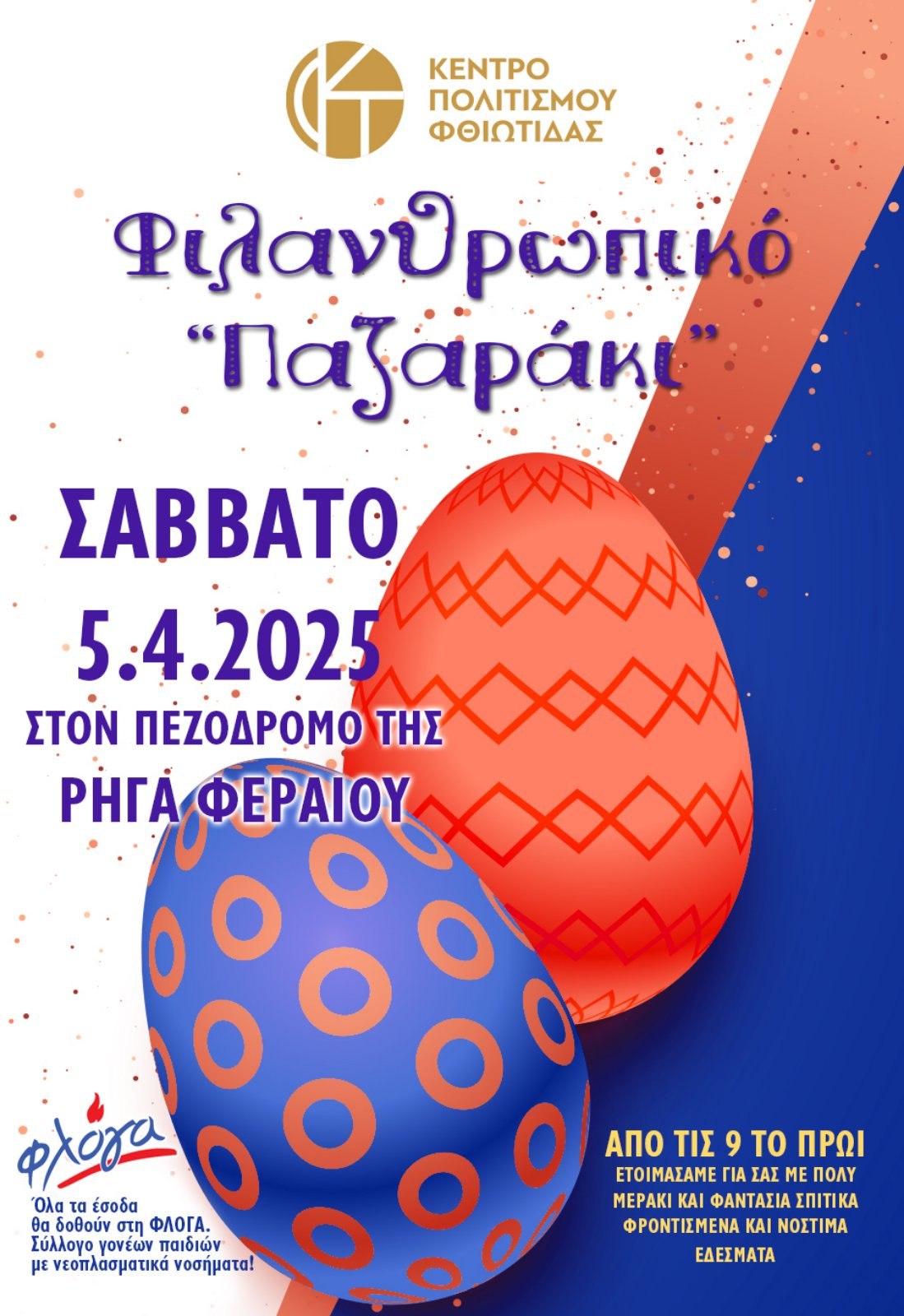 Το Κέντρο Πολιτισμού Φθιώτιδας σας προσκαλεί στο καθιερωμένο Πασχαλινό Φιλανθρωπικό Παζάρι το Σάββατο 5 Απριλίου στον πεζόδρομο της Ρήγα Φεραίου, από τις 9:00' το πρωί μέχρι αργά το απόγευμα, με χειροποίητες λιχουδιές και ανοιξιάτικες κατασκευές, αλλά και πολύ κέφι και χαμόγελα!