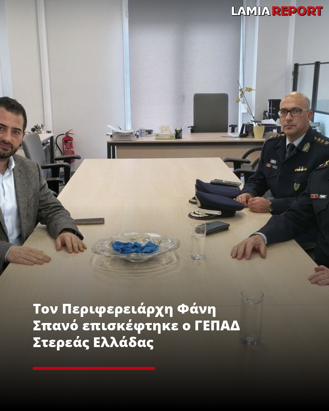 Ο Γενικός Περιφερειακός Αστυνομικός Διευθυντής Στερεάς Ελλάδας, Ταξίαρχος Κωνσταντίνος Πελεκάνος, συνοδευόμενος από τον Αστυνομικό Διευθυντή Κωνσταντίνο Κουκουβίνο του Επιτελείου της Γενικής, πραγματοποίησε σήμερα (11-02-2026) το πρωί, εθιμοτυπική επίσκεψη στον Περιφερειάρχη Στερεάς Ελλάδας, Φάνη Σπανό.