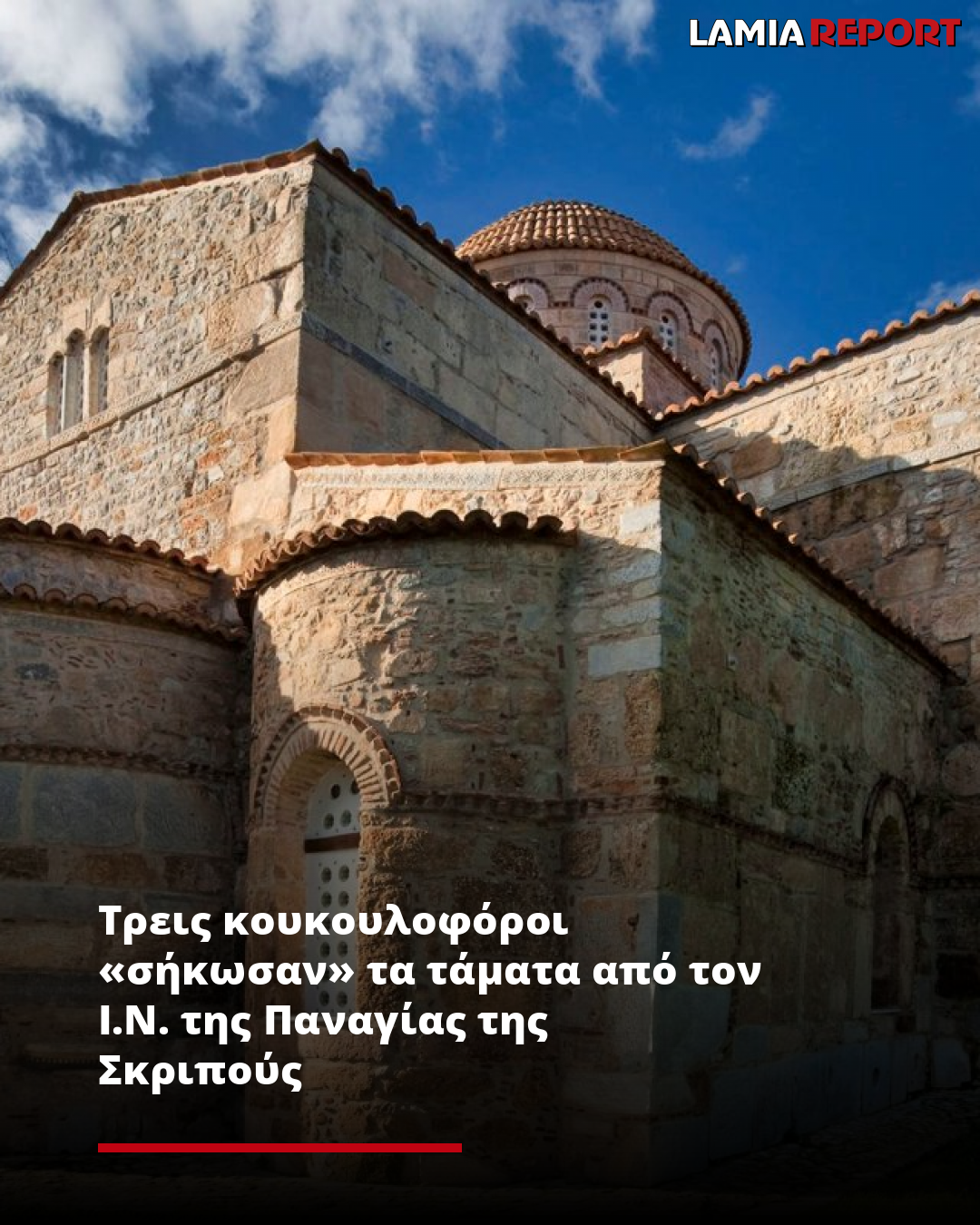 Τρεις άγνωστοι δράστες τα ξημερώματα της 2ας Μαΐου φορώντας κουκούλες, κατάφεραν να εισέλθουν στον Ιερό Ναό της Κοιμήσεως της Θεοτόκου (Παναγίας της Σκριπούς) στον Ορχομενό και να «σηκώσουν» τα τάματα των πιστών προς τη Μεγαλόχαρη ύψους περί των 5.000 ευρώ.