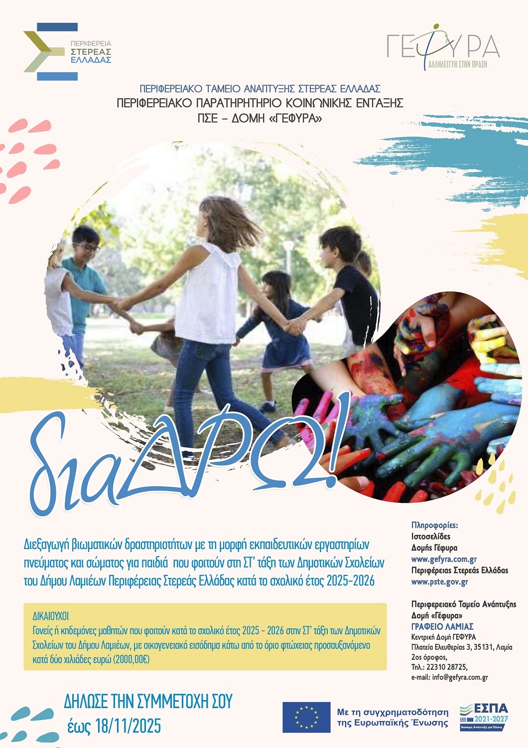 Η Περιφέρεια Στερεάς Ελλάδας μέσω του Περιφερειακού Παρατηρητηρίου Κοινωνικής Ένταξης – Δομή «ΓΕΦΥΡΑ» προχωρά στην πιλοτική υλοποίηση της δράσης «διαΔΡΩ» με χρηματοδότηση από πόρους του Ευρωπαϊκού Κοινωνικού Ταμείου (ΕΚΤ+).