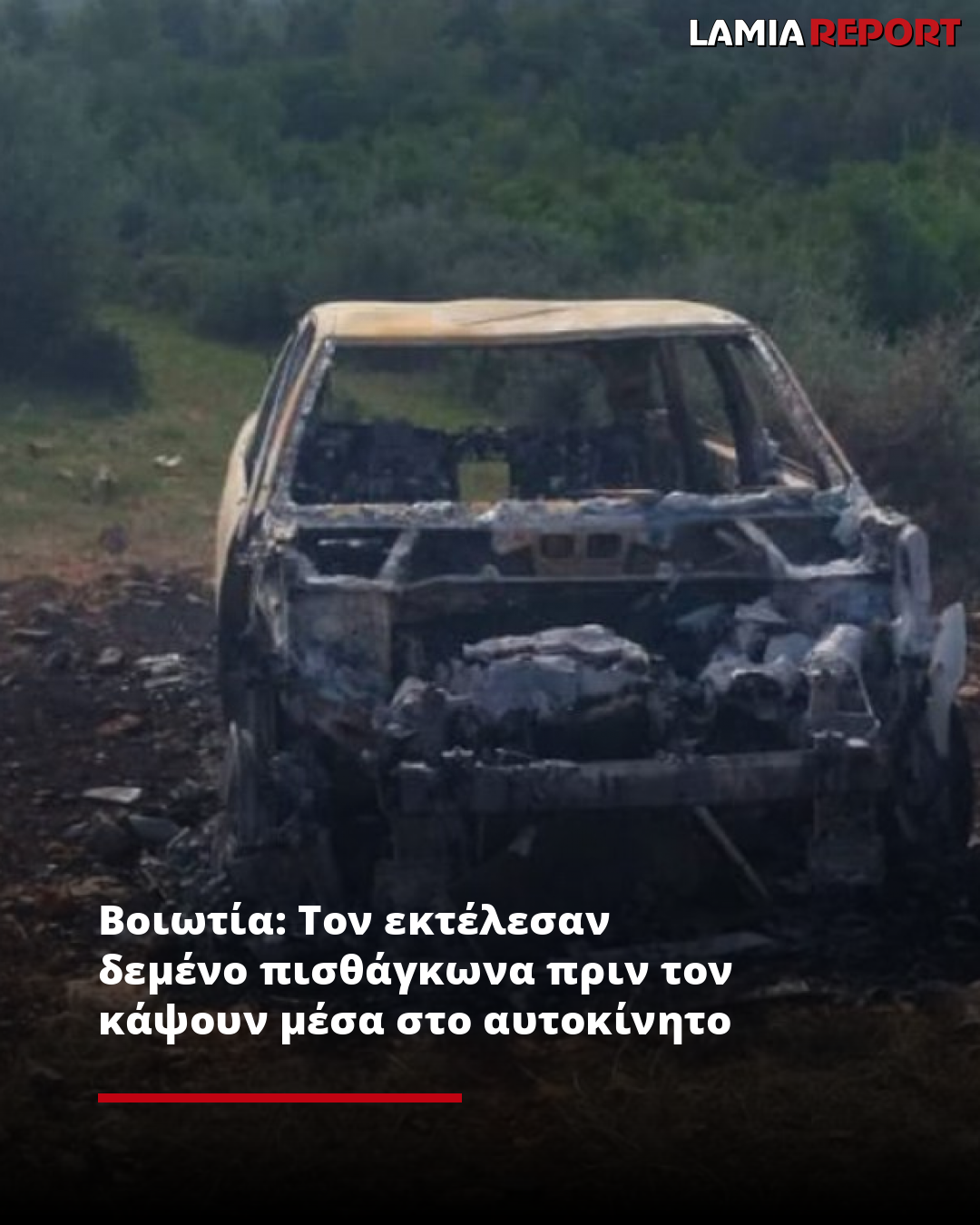 Σύμφωνα με το ρεπορτάζ του LamiaReport, το θύμα προτού δεθεί και καεί μέσα στο αυτοκίνητο που είχε κλαπεί από περιοχή της Αττικής, είχε πυροβοληθεί τουλάχιστον μια φορά.