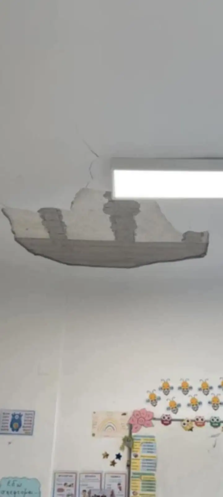 Έπεσαν σοβάδες από το ταβάνι σε σχολική αίθουσα, ευτυχώς δεν ήταν σε ώρα μαθήματος, βρισκόμενοι οι μαθητές στο προαύλιο λόγω εκδήλωσης για το έθιμο της Τσικνοπέμπτης. Παρόμοιο επεισόδιο προ μηνών έχει συμβεί και σε άλλη σχολική μονάδα της πόλης».