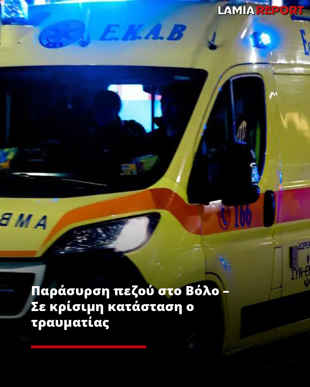 Ο τραυματίας μεταφέρθηκε σοβαρά χτυπημένος στο Γενικό Νοσοκομείο Βόλου, όπου νοσηλεύεται σε κρίσιμη κατάσταση.