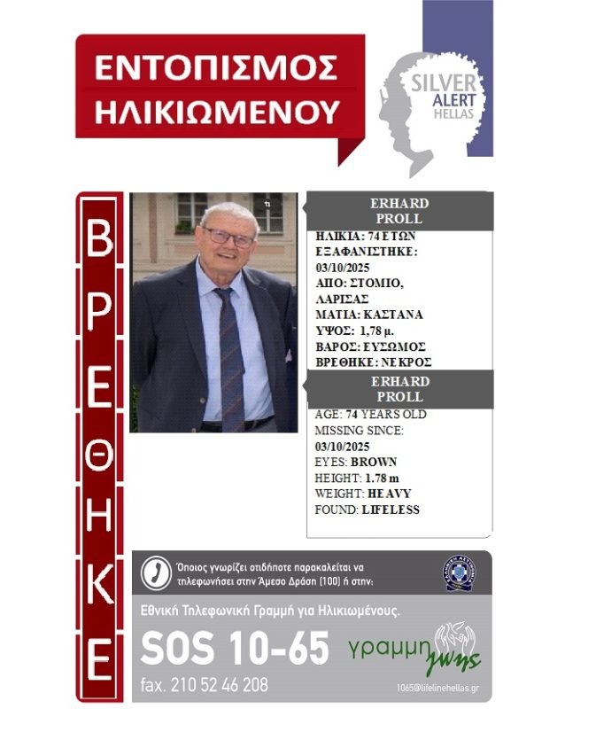 Νεκρός βρέθηκε ο 74χρονος Αυστριακός Frhard Proll (Ερχαρντ Προλ) που αναζητούνταν με SILVER ALERT από τις 3/10/2025.