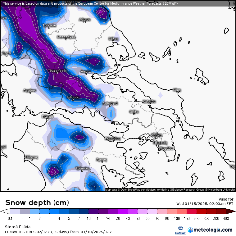 Στον επόμενο χάρτη μπορείτε να δείτε το εκτιμώμενο πάχος της χιονόστρωσης.