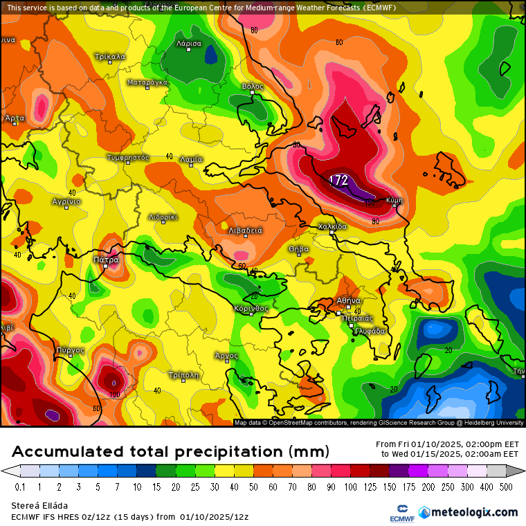 Στον επόμενο χάρτη μπορείτε να δείτε τον συνολικό υετό μέχρι το πέρας της κακοκαιρίας (δηλαδή μέχρι την Τετάρτη).