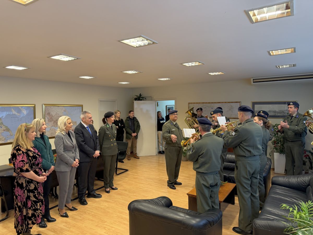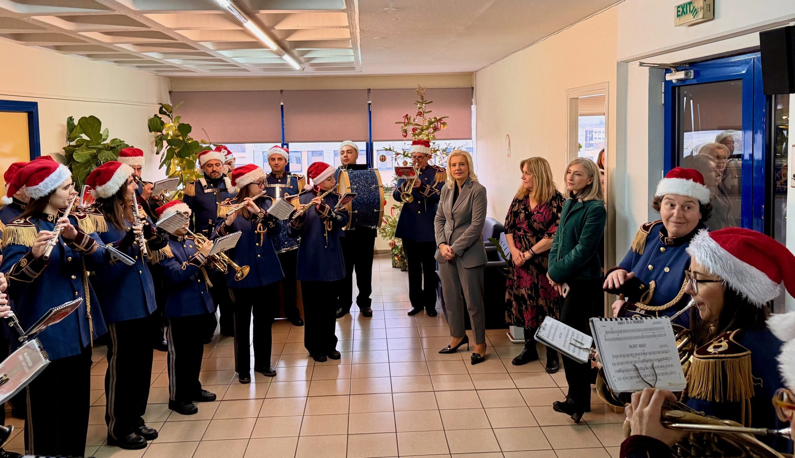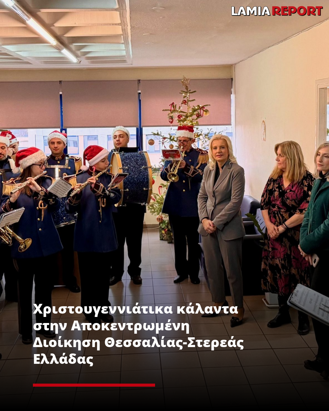 Τη Γενική Γραμματέα της Αποκεντρωμένης Διοίκησης Θεσσαλίας – Στερεάς Ελλάδας, κα Ρένα Καραλαριώτου, επισκέφθηκαν σήμερα, παραμονή Χριστουγέννων, για να ψάλουν τα χριστουγεννιάτικα κάλαντα, η Φιλαρμονική του Δημοτικού Ωδείου Λάρισας (ΔΩΛ), η μπάντα της 1ης Στρατιάς, καθώς και η μπάντα της 110 Πτέρυγας Μάχης.