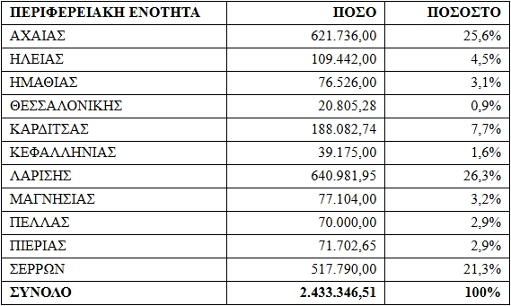 Συγκεκριμένα, με την 5η κατανομή καταβλήθηκαν 2.433.346,51 €, ενισχύοντας σημαντικά τις Περιφερειακές Ενότητες Λάρισας (26,3%), Αχαΐας (25,6%) και Σερρών (21,3%).