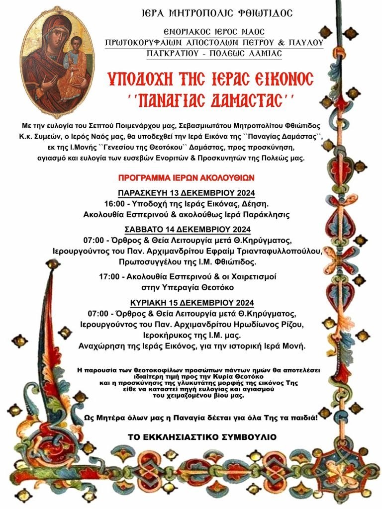Την Ιερά Εικόνα της «Παναγίας Δαμάστας» εκ της Ιεράς Μονής «Γενεσίου της Θεοτόκου» Δαμάστας, θα υποδεχτούν την Παρασκευή 13 Δεκεμβρίου 2024, με την ευλογία του Σεβασμιωτάτου Μητροπολίτου Φθιώτιδος κ. Συμεών στον Ιερό Ναό Αποστόλων Πέτρου και Παύλου Παγκρατίου Λαμίας.