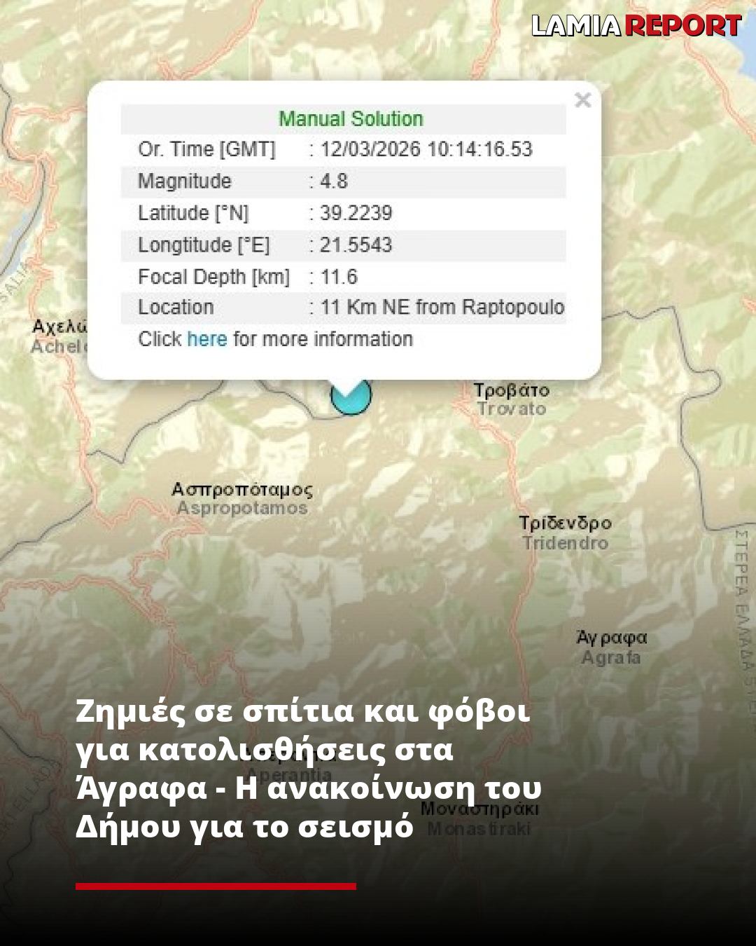 «Σεισμική δόνηση μεγέθους 4,8 Ρίχτερ σημειώθηκε στις 12:14, σύμφωνα με την ενημέρωση του Επιχειρησιακού Κέντρου, και έγινε αισθητή στο σύνολο του Δήμου Αγράφων.