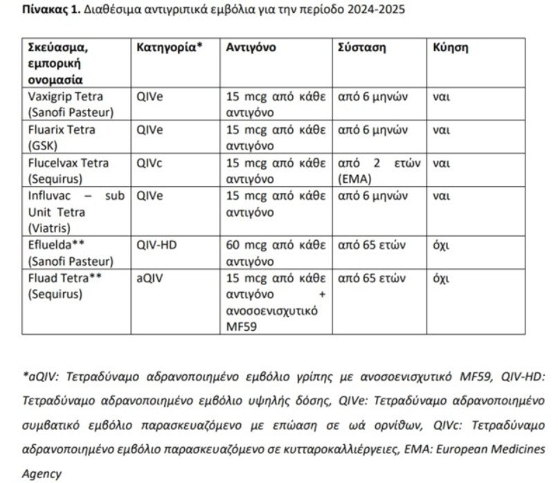 Στη χώρα μας, τη χρονική περίοδο 2024-2025, αναμένεται να είναι διαθέσιμα τα παρακάτω αντιγριπικά εμβόλια: