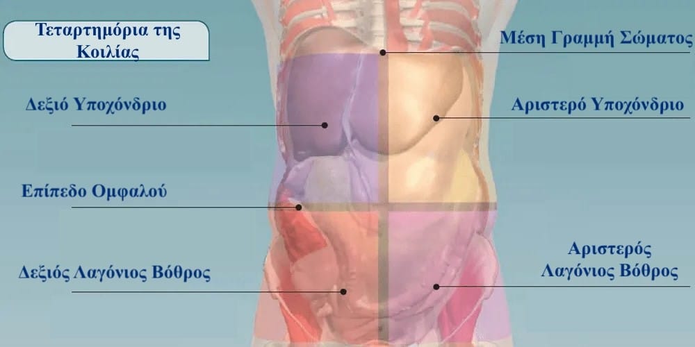 Ο πόνος στην κοιλιά μπορεί να αφορά στο σύνολο της κοιλιακής χώρας ή να εμφανισθεί σε ένα μόνο τεταρτημόριο της κοιλιακής χώρας, γεγονός που προσφέρει χρήσιμες διαγνωστικές πληροφορίες όσον αφορά στην ανεύρεση του αιτίου που τον προκαλεί.